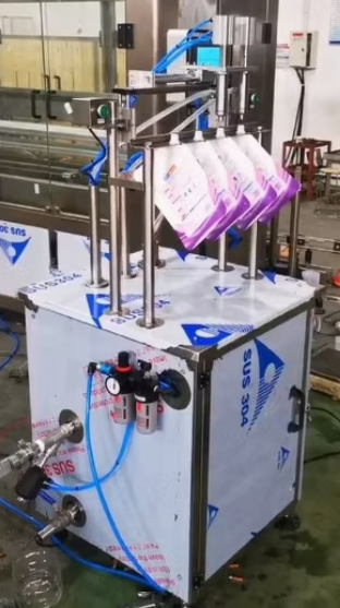 This method is for filling liquids and semi-liquids. Fill it from the Bottom Up. Use a filling nozzle that goes deep inside the pouch. This will stop the liquid from splashing onto the seal area. So the seal area stays clean and dry. A nozzle that does not drip is also very important.
