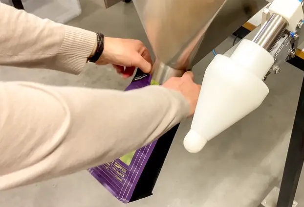 This method is for filling dry goods. Use a Funnel to Control Dust. The funnel should go inside the pouch opening. It should not just rest on top. This directs powders or grains down into the bag. So the dust does not get in the seal area. A clean seal area is needed for a strong seal.