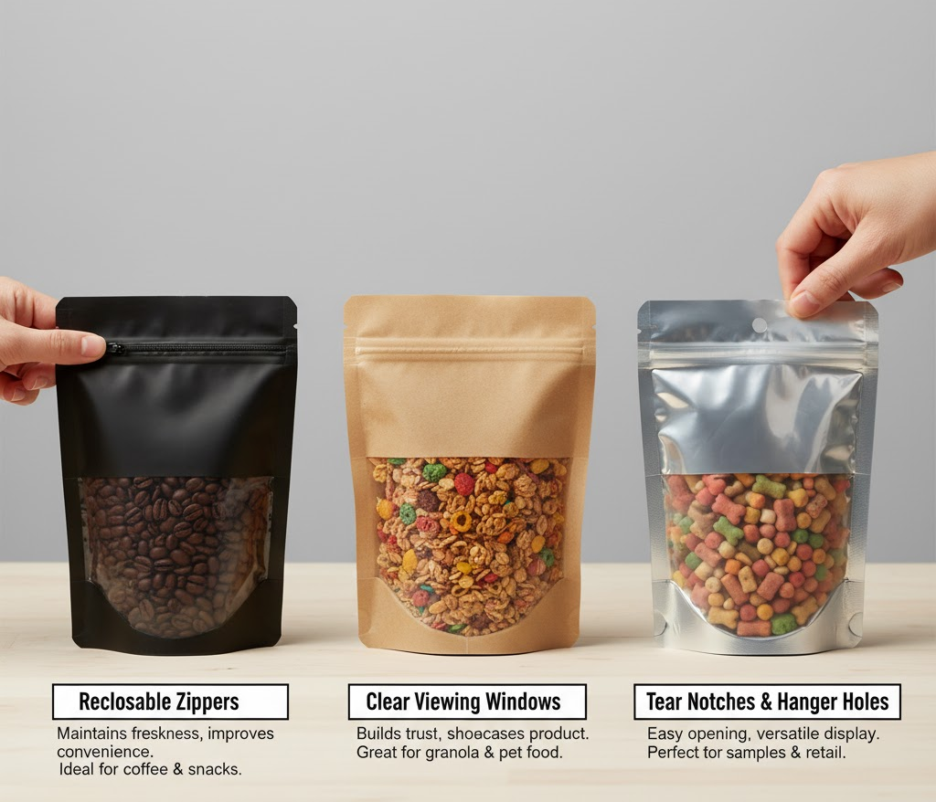 The basic pouch is highly adaptable. You can add features that significantly improve how the consumer interacts with your product.